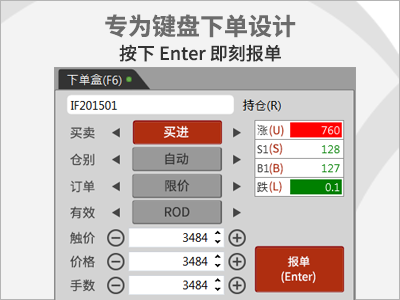 专为键盘下单设计,通过组合键功能,快速设定价格、数量与委托单别,按下 Enter 即刻报单。